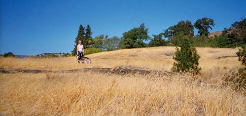 Jenn and Loch in the golden grasses that dress the hillsides of the